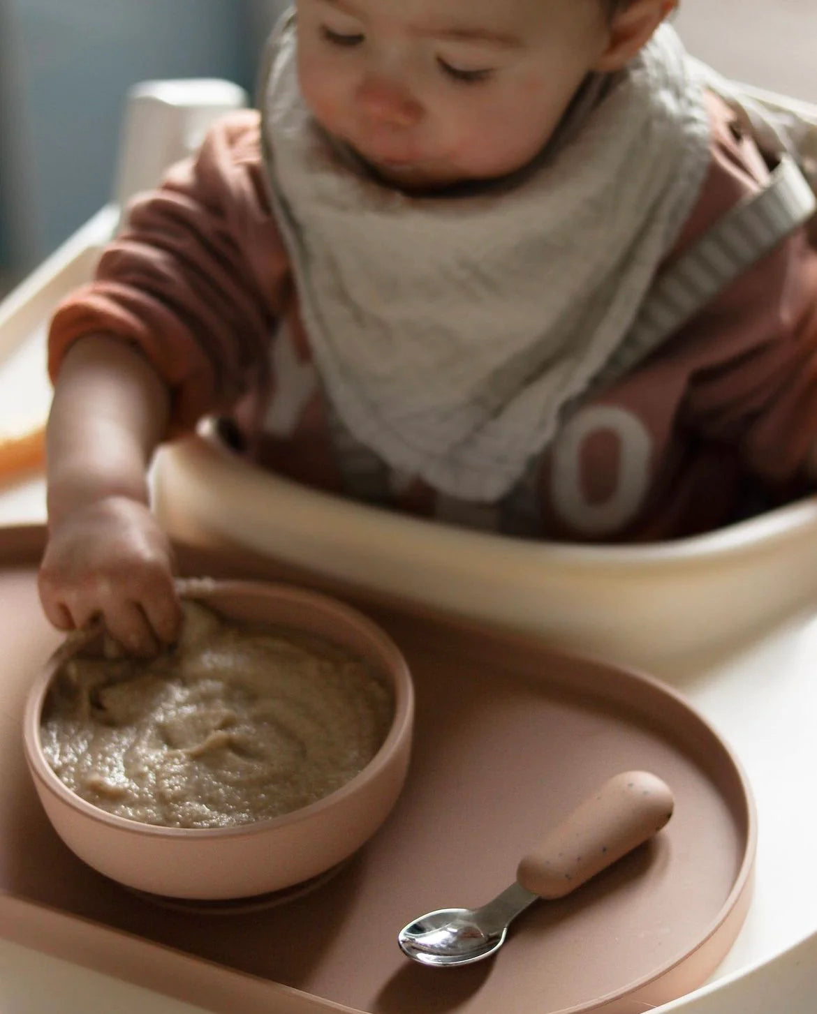 Dubenėlis yra kruopščiai sukurtas atsižvelgiant į jūsų vaiko perspektyvą. Jis yra pakankamai gilus, kad vaikas matytų dubenyje esantį maistą, o vidinėje krašto pusėje yra išlenktas kraštas, kuris pasviręs į vidų, kad būtų lengviau uždėti maistą ant šaukšto.