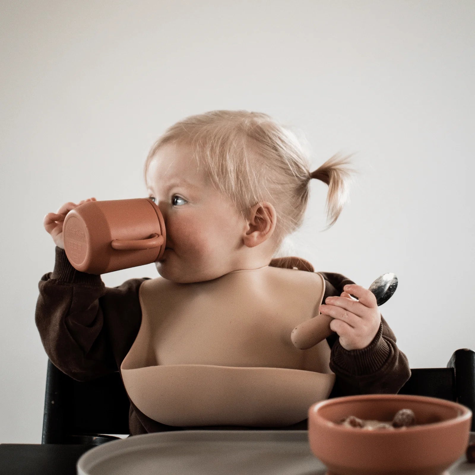 Puodelis su snapeliu pagamintas iš 100% maistinio silikono ir ergonomiškai suprojektuotas taip, kad tilptų į mažas rankas. Jis yra tik tinkamo dydžio ir turi dvi tvirtas rankenas, kurios padės jūsų vaikui tinkamai subalansuoti svorį.