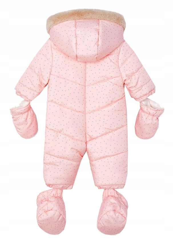 - Kombinezonas ilgomis rankovėmis naujagimiui. Apykaklė su gobtuvu. Gobtuvas su kailio apdaila. Dvigubas užtrauktukas priekyje.