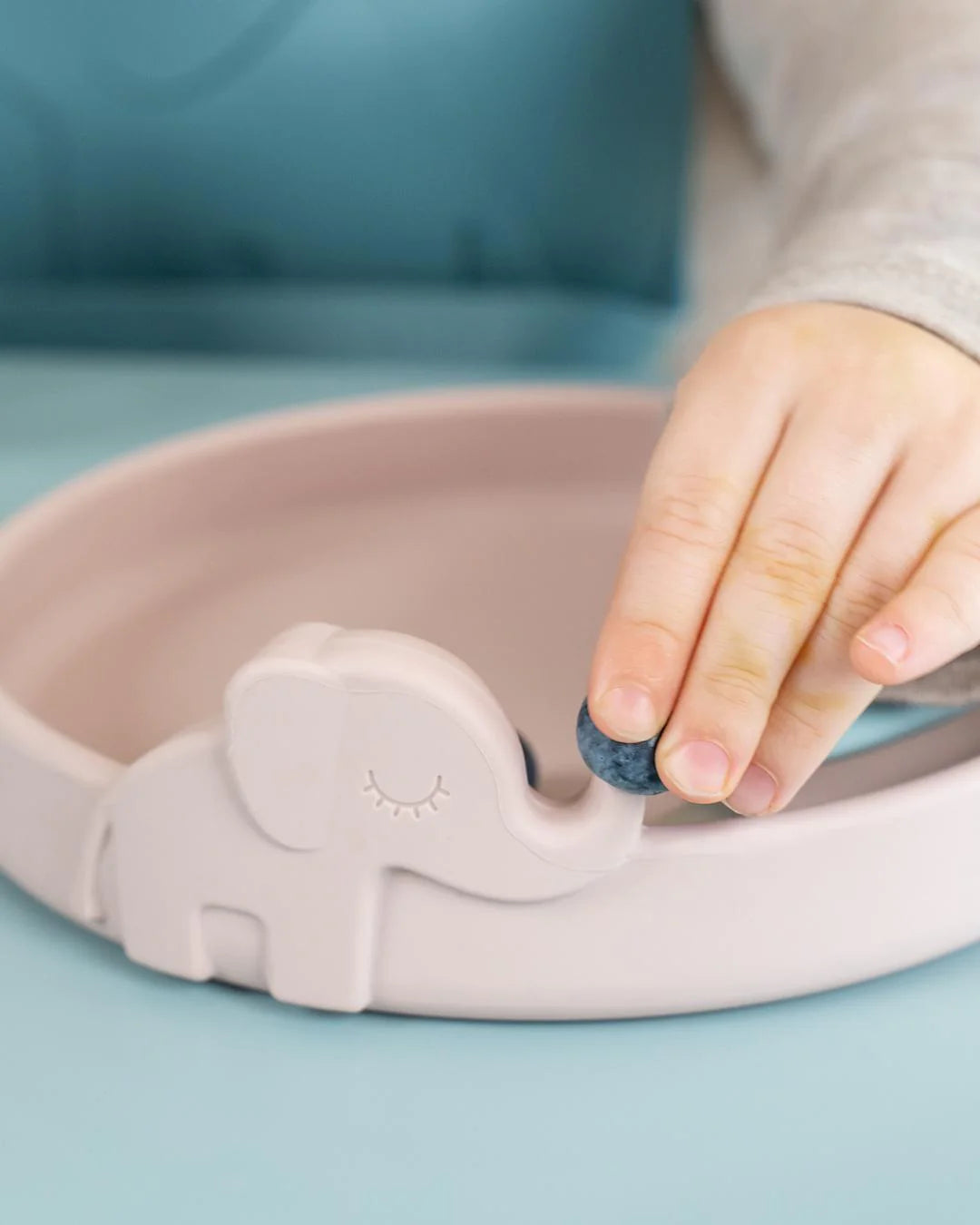 Drambliukas žvilgčioja iš mielos ir praktiškos silikoninės lėkštės, pasiruošęs vaiko valgymą paversti smagiu dienos užsiėmimu. Lėkštė yra suapvalintais vidiniais kraštais, todėl, vaikui mokantis maitintis savarankiškai, ši Done by Deer lėkštė tinka kone idealiausiai.