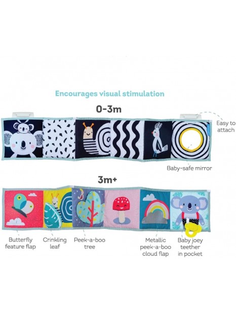 Minkštoje knygelėje yra kūdikiui saugus veidrodis, tekstūruoti audiniai, Joey Koala kramtukas ir žaidimų kišenė, kuri patrauks kūdikio dėmesį ir leis jam žaisti bei mėgautis.