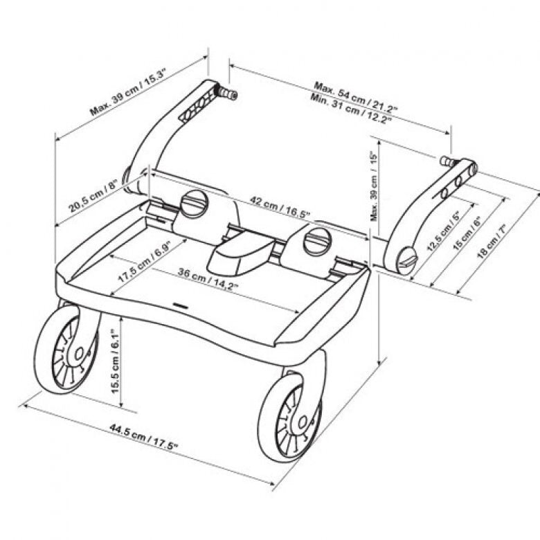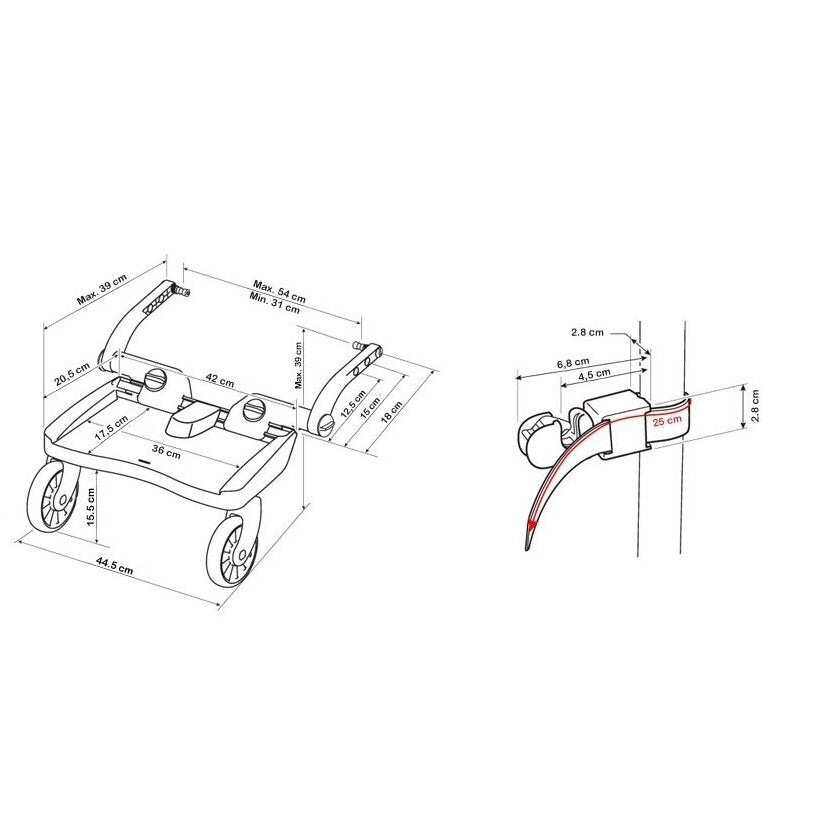 BuggyBoard platfoma ant ratukų tvirtinama prie vežimėlio rėmo. Ji skirta vaikams nuo 2 iki 5 metukų, iki 20 kg svorio.