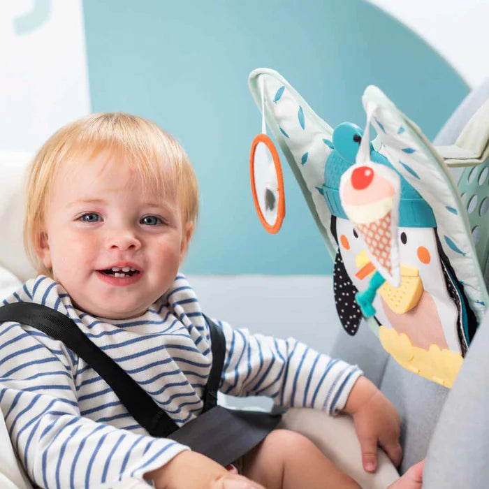 Inovatyvus kelioninis žaislas, skirtas linksminti vaikus, keliaujančius atgal atgręžtais, užtikrinant linksmybes, tobulėjimą ir saugumą viename. Kelioninis žaislas groja muziką ir šviesą, kurią įjungia jūsų kūdikio spyris, mokydamas jį priežasties ir pasekmės, todėl keliauti automobiliu daug lengviau. Inovatyvus veiklos centras, specialiai sukurtas pramogauti atgal atsuktus vaikus.