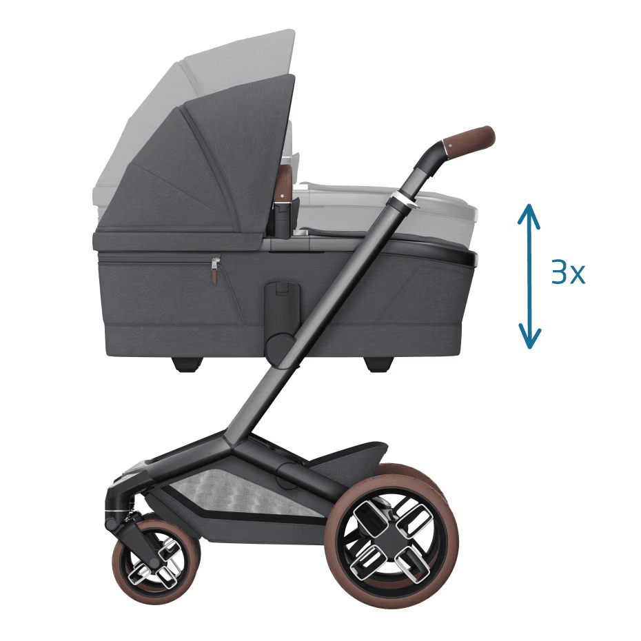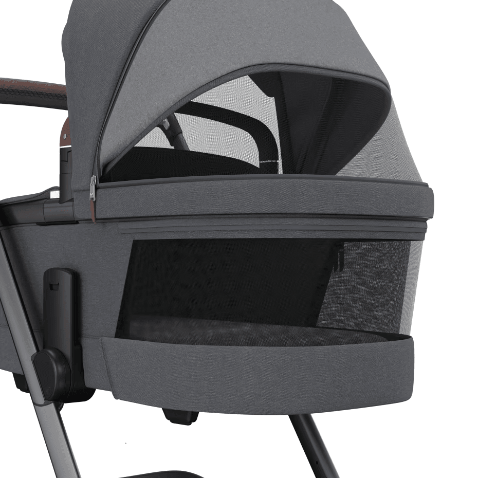 Reguliuojamo aukščio vežimėlio krepšys su pasukamu ir atminties putų čiužiniu viduje. Taip pat dirželiu traukiama SoothingSlope gulimoji padėtis, siekiant sumažinti refliuksą.