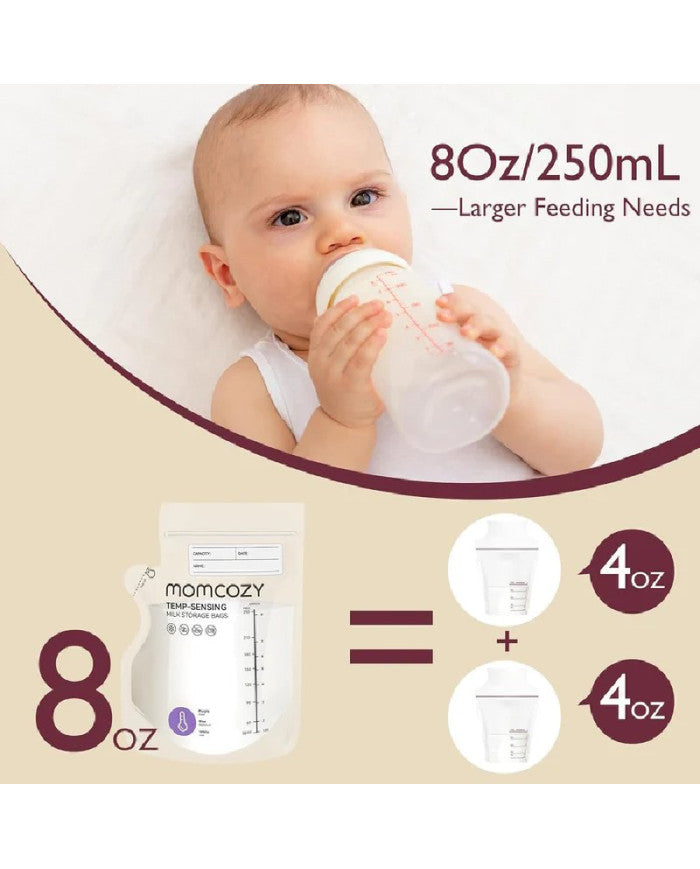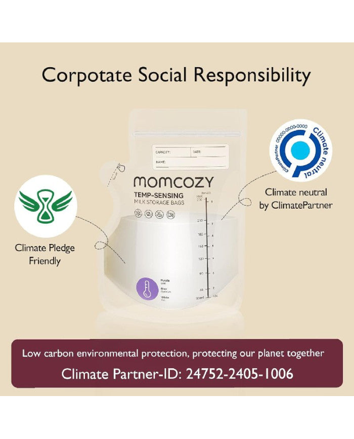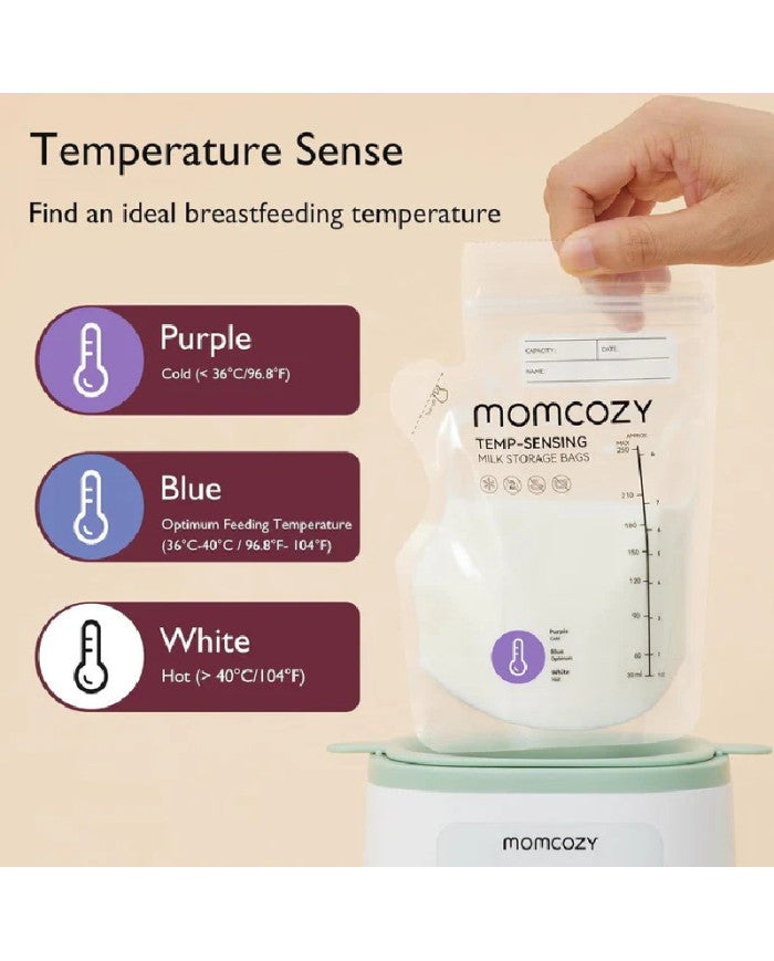 - Temperatūros indikatorius. MOMCOZY pieno laikymo maišeliai padeda tėvams tiksliai nustatyti pieno temperatūrą be termometro. Tiesiog pažvelkite į temperatūros indikatoriaus spalvą: violetinė – šalta (<36 ℃ / 96,8 ℉), mėlyna – optimali maitinimo temperatūra (36-40 ℃ / 96,8–104 ℉), o balta – karšta (>40 ℃ / 104 ℉).