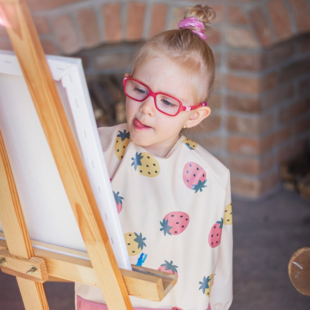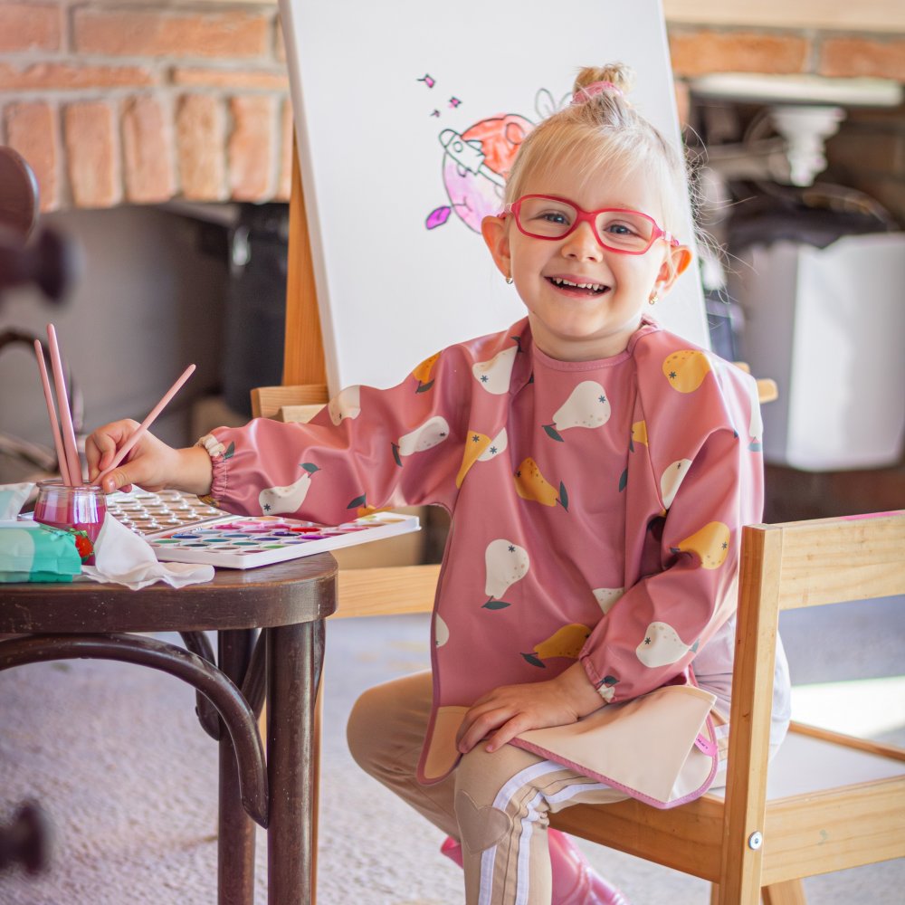 - Atsparus vandeniui pagamintas iš poliesterio, padengtas poliuretanu (PU) sudėtyje nėra PVC ir ftalatų trupinių kišenė ilgos rankovės su elastine juostele minkštas velcro lengva valyti švelnaus prisilietimo skirtas 24m+ vaikams išmatavimai: 38 x 42cm